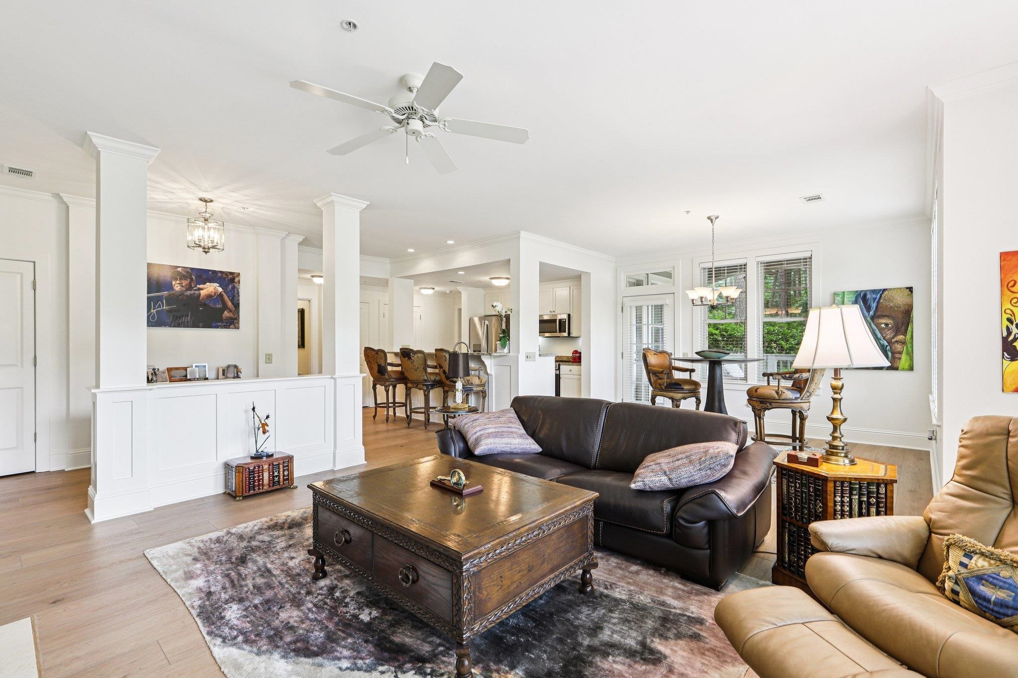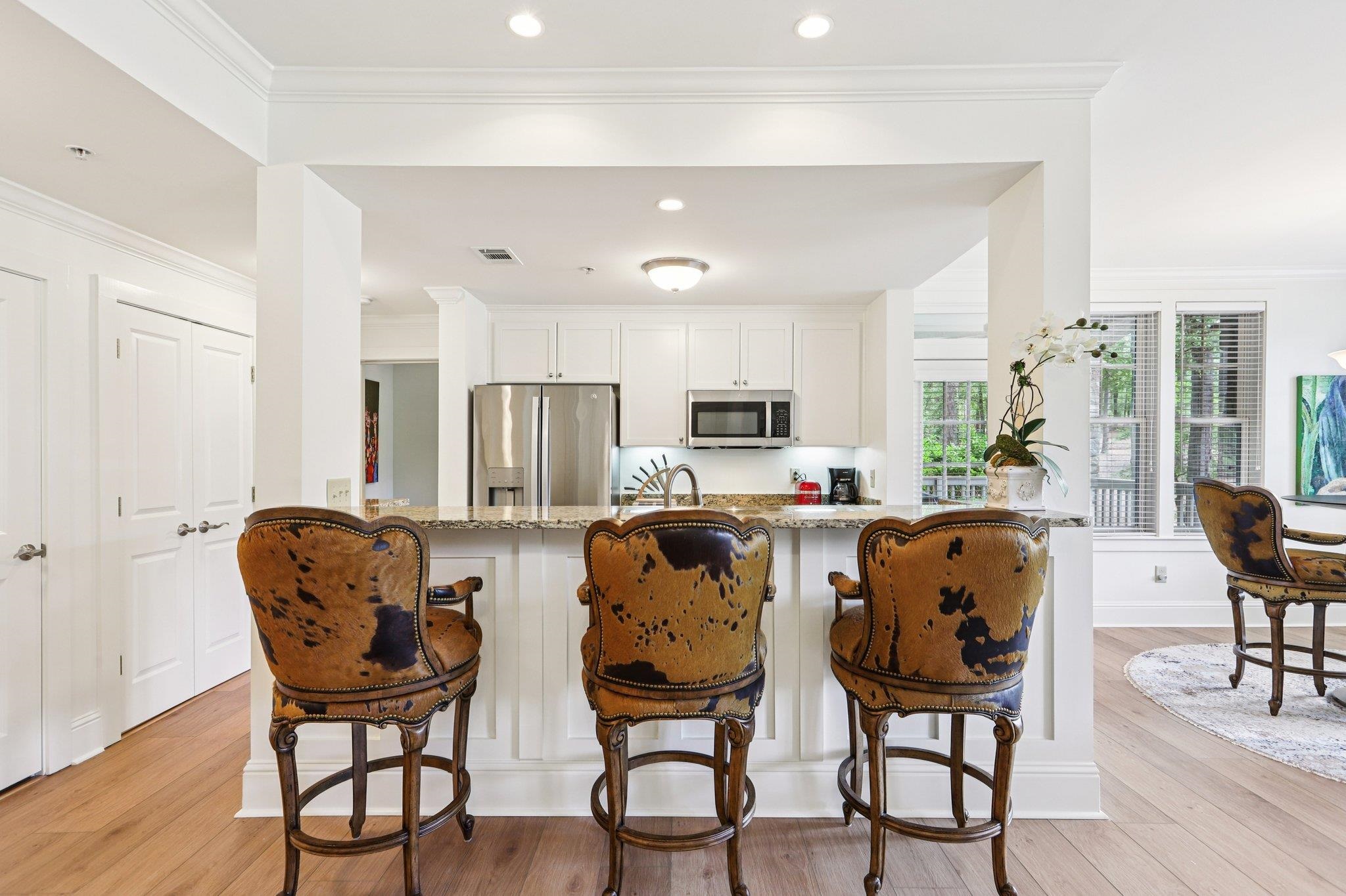 The primary suite offers an en-suite bath and walk-in closet, while the guest bedroom is well-sized with access to a full bath. A one-car detached garage provides secure parking and additional storage. The condo is conveniently located near the Lake Club, walking trails, marina, golf courses, dining, and resort-style amenities within Reynolds Lake Oconee.