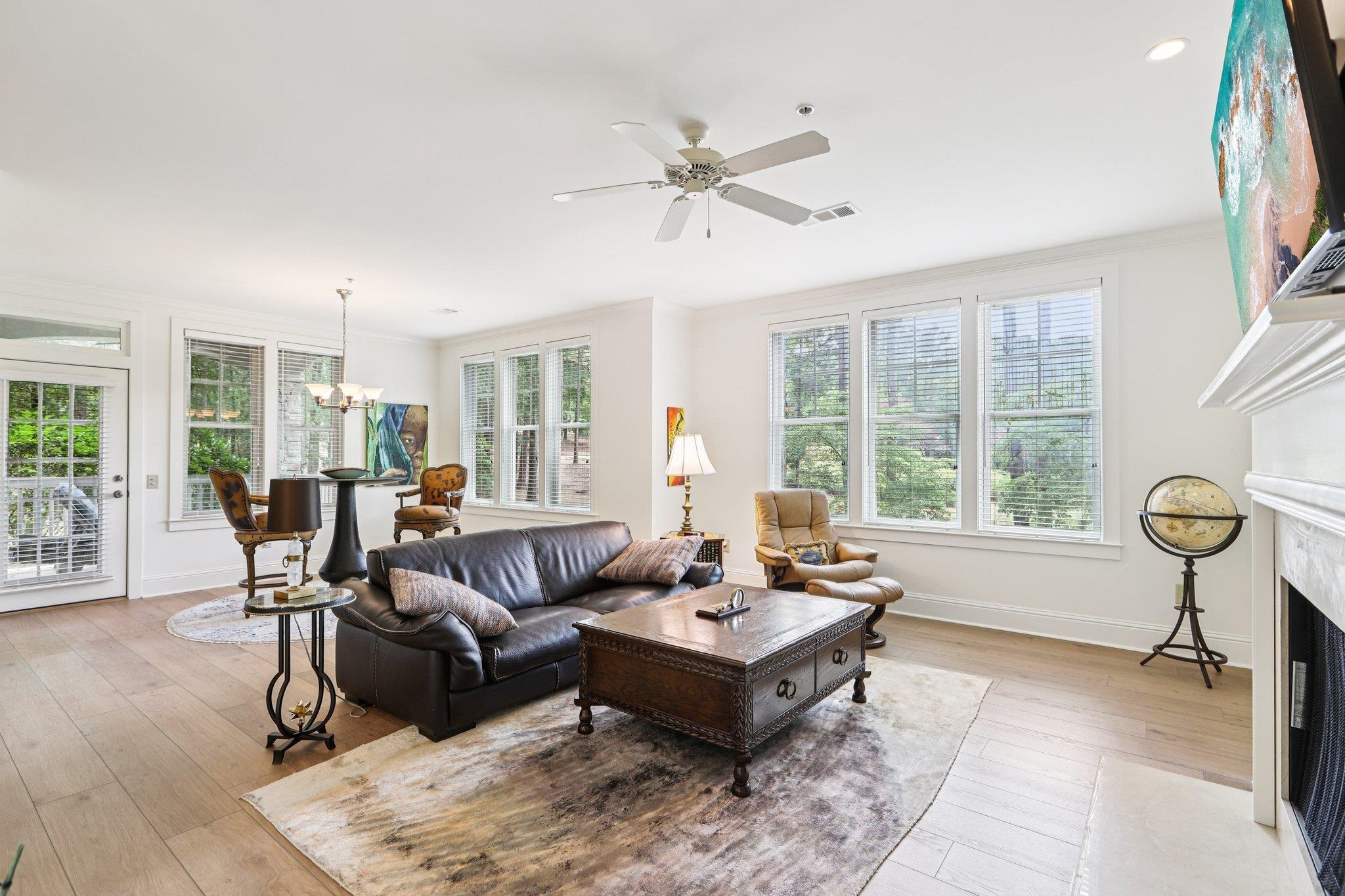 The open-concept floor plan features fresh interior paint, updated finishes, and abundant natural light. The kitchen includes granite countertops, modern appliances, and ample cabinet storage, opening seamlessly to the living and dining areas. Sliding doors lead to a covered patio with wooded surroundings and Oconee Golf Course views, creating a peaceful outdoor setting.