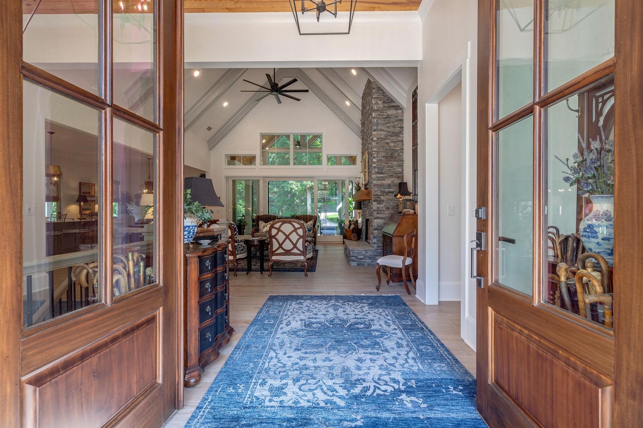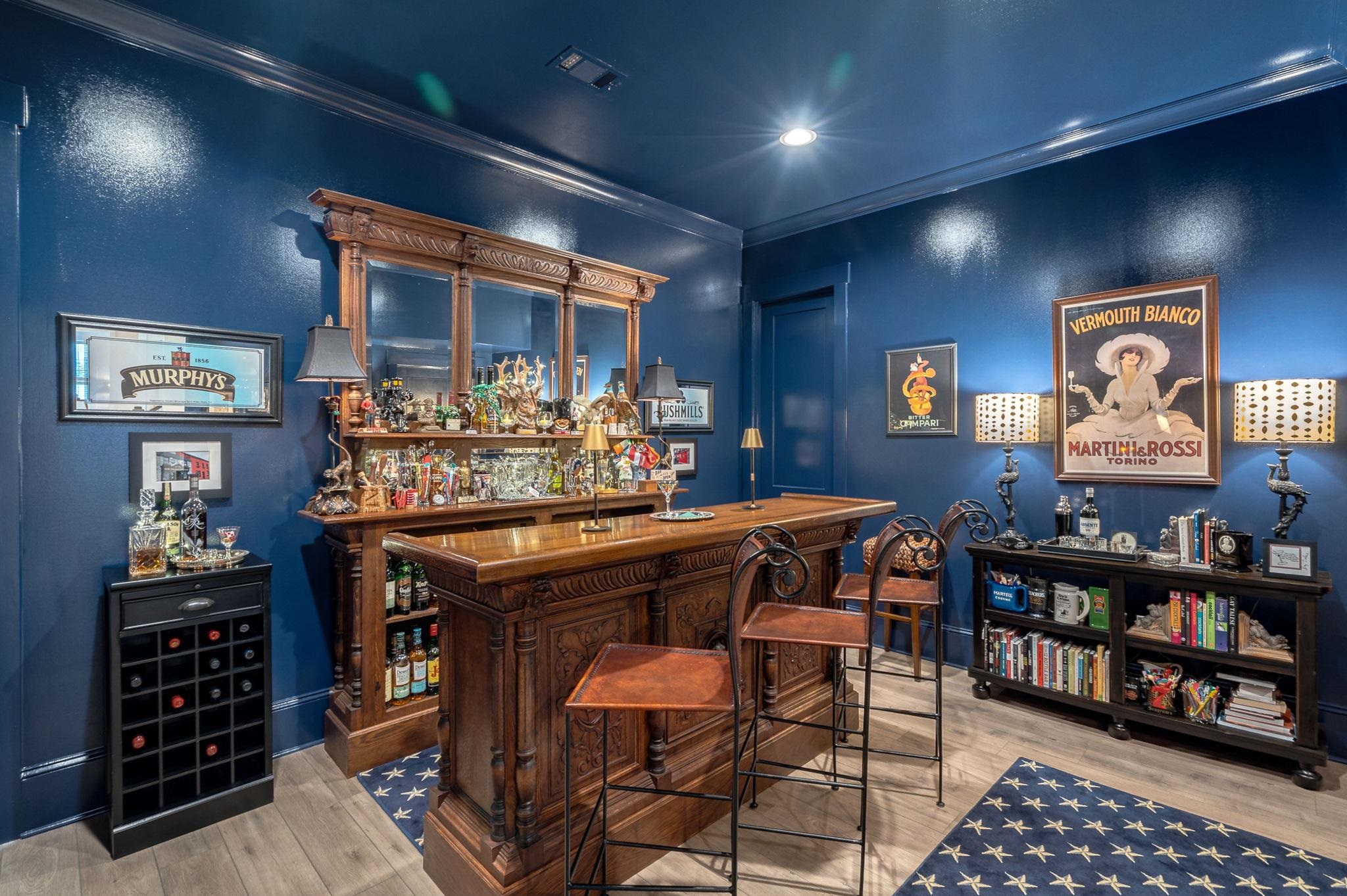 The primary suite on the main level includes dual vanities, a large walk-in closet, and a spa-style bath with a soaking tub and separate shower. Upstairs, a private study above the garage offers an ideal space for guests or a home office. The terrace level features three guest bedrooms, a spacious family room, and a one-of-a-kind antique bar, a hidden retreat that can easily serve as a wine cellar, fitness area, or home theater.
