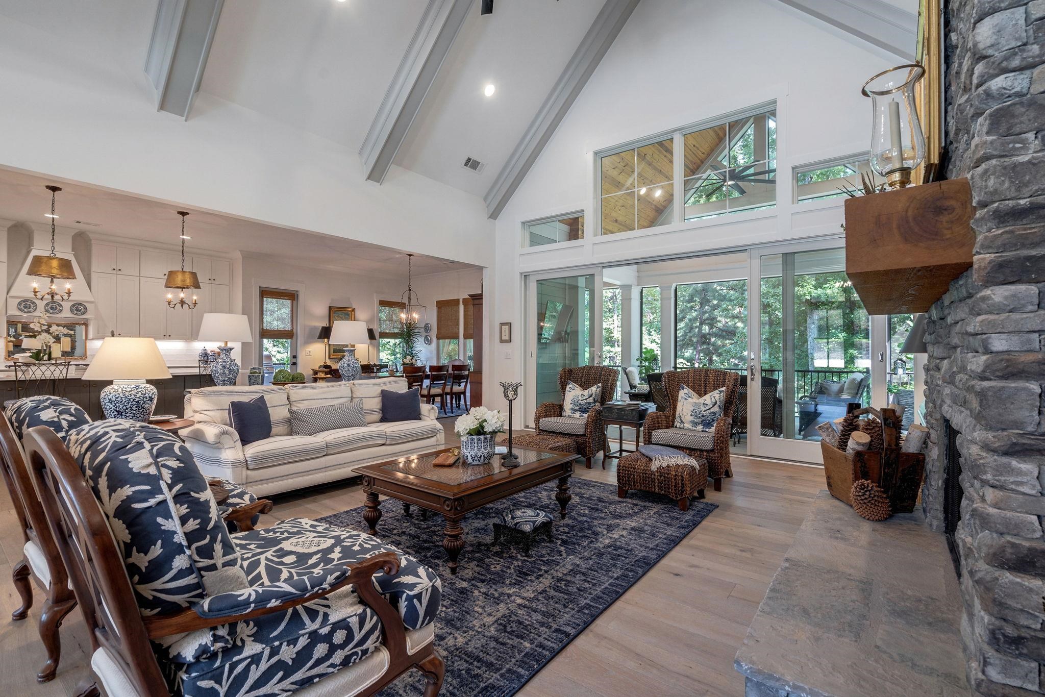 Inside, the open-concept main level combines modern design and natural materials for a warm, inviting feel. The great room features a vaulted, beamed ceiling, stacked stone fireplace, and hardwood floors, flowing into a chef’s kitchen with professional-grade stainless appliances, double ovens, gas cooktop, and a wine/beverage refrigerator. The vaulted screened porch and covered deck create a seamless transition between indoor and outdoor living—perfect for entertaining or relaxing with views of the fairway and lake.