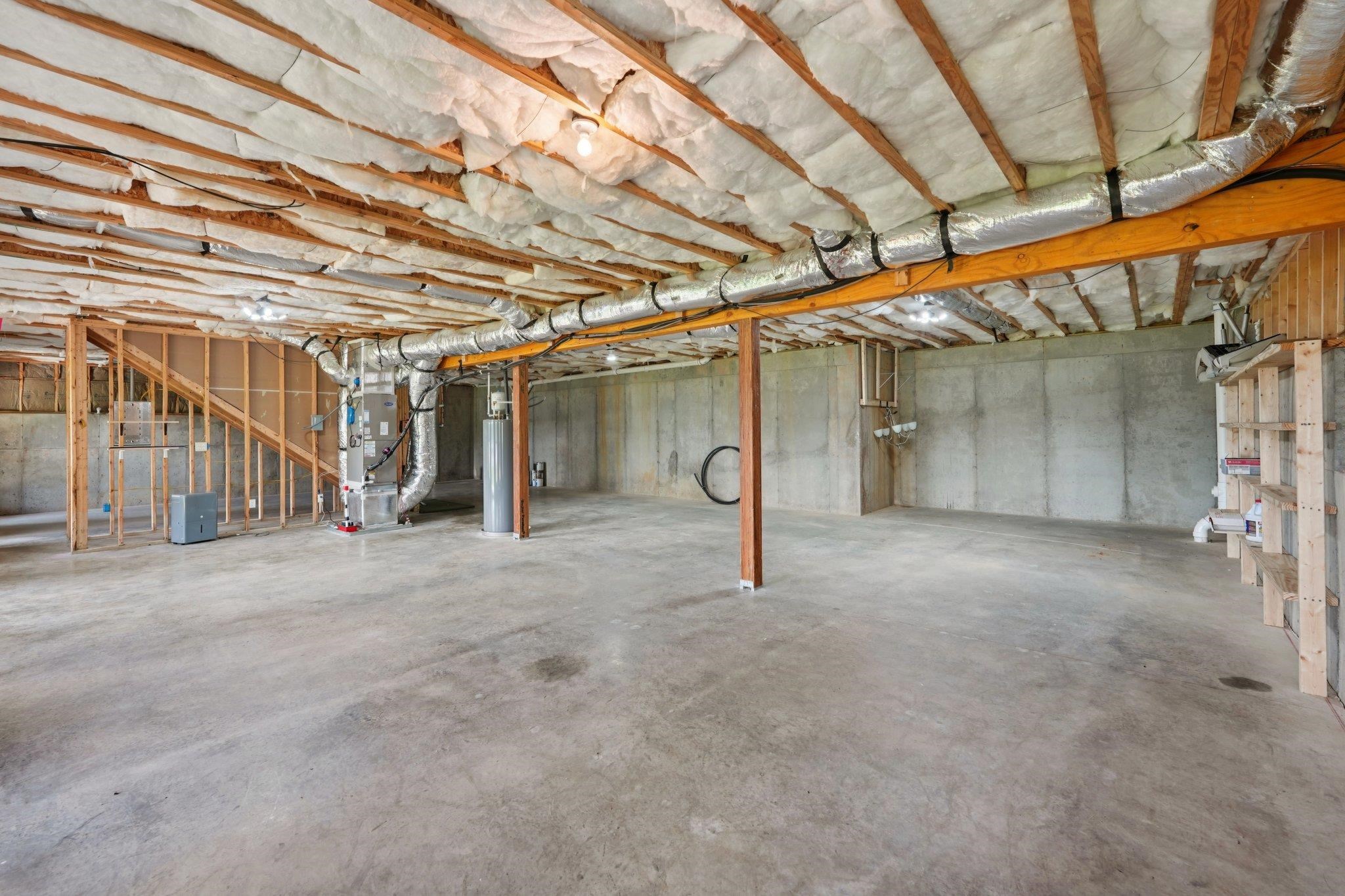 The kitchen includes a center island, breakfast bar, solid-surface counters, stainless-steel appliances, and pantry. The primary suite on the main level overlooks the lake and offers a large walk-in closet, dual sinks, and a separate shower. A full terrace level is unfinished but plumbed and wired—ready for additional bedrooms, a media room, or gym.