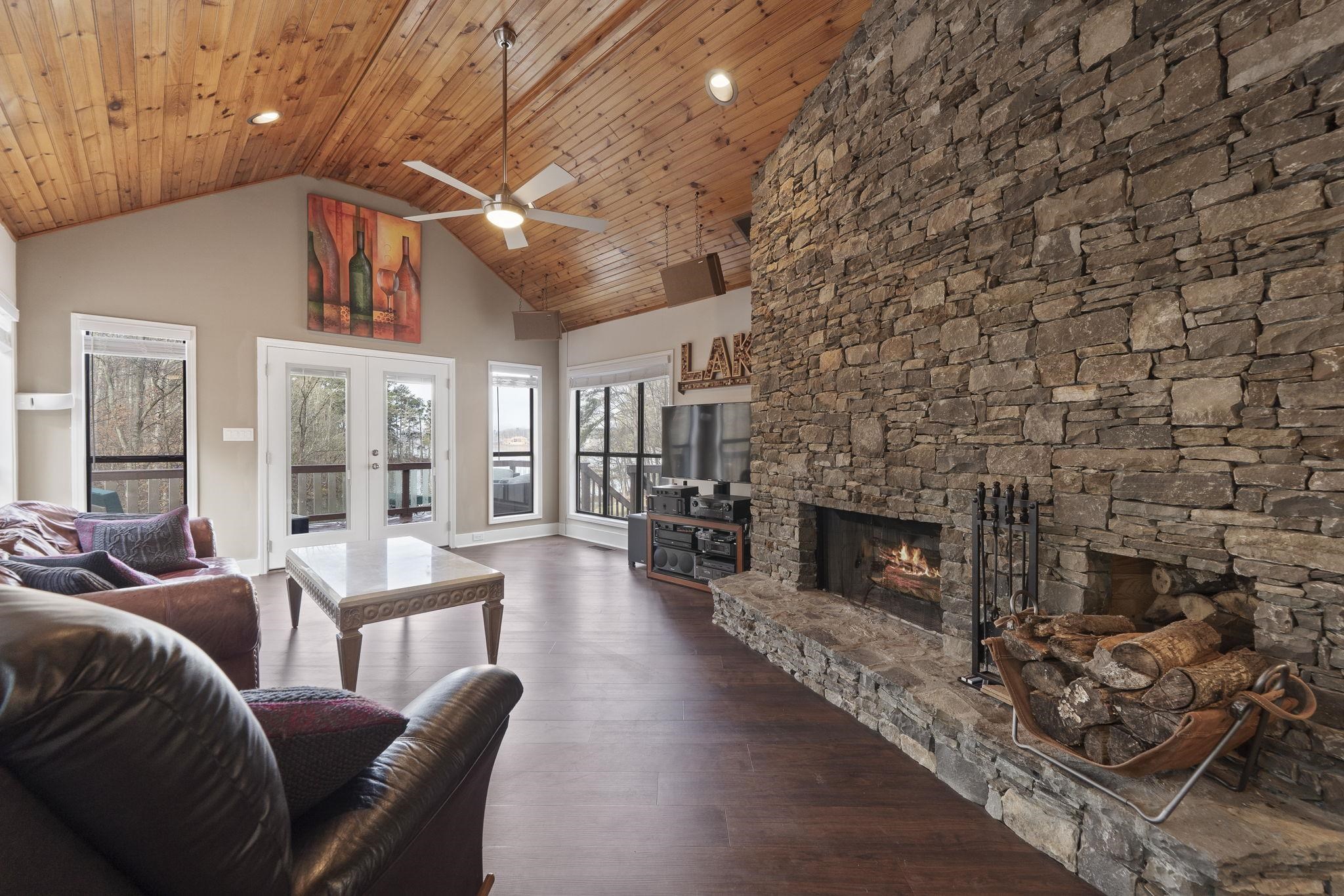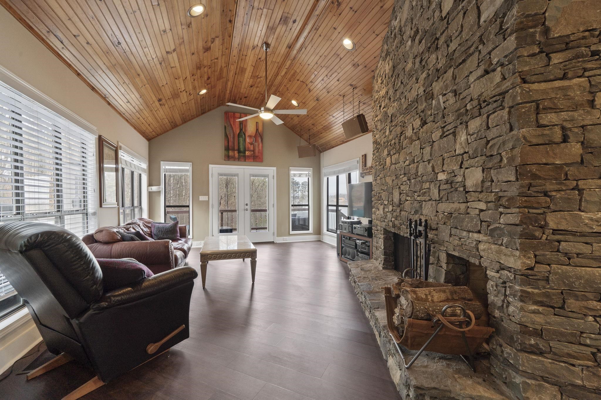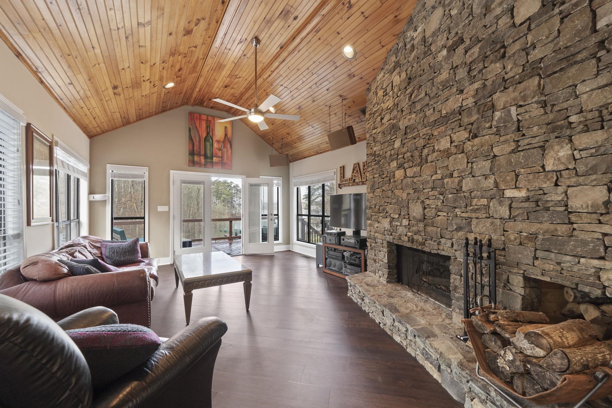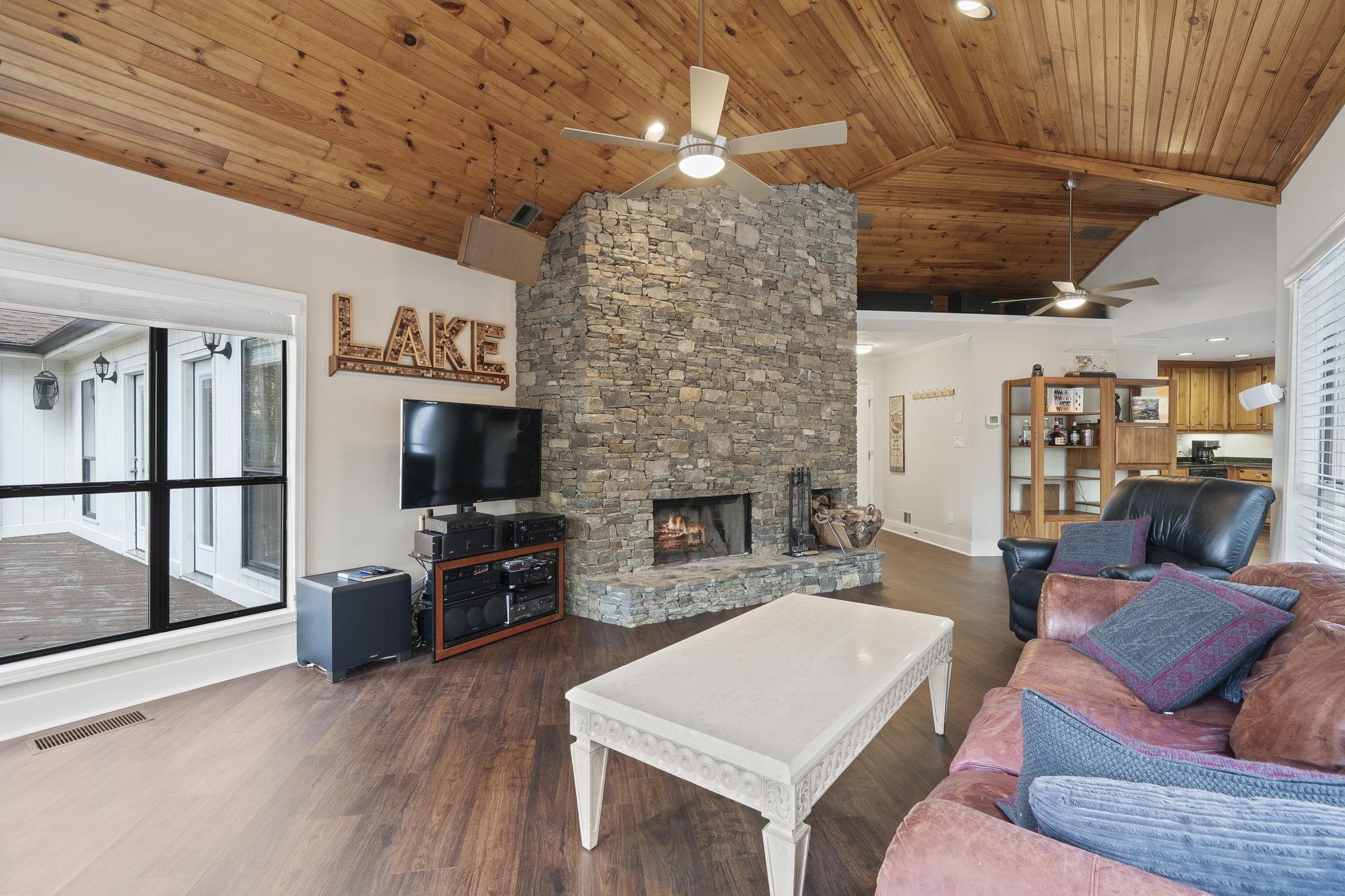 The ranch-style residence features five bedrooms and 3.5 baths, including a spacious primary suite on the main level with a fully renovated bath and dual vanities. The open-concept living area showcases a stacked-stone wood-burning fireplace, updated kitchen with bar seating, and a dining area that opens to a full-length lakeside deck and screened porch — ideal for outdoor dining and entertaining.