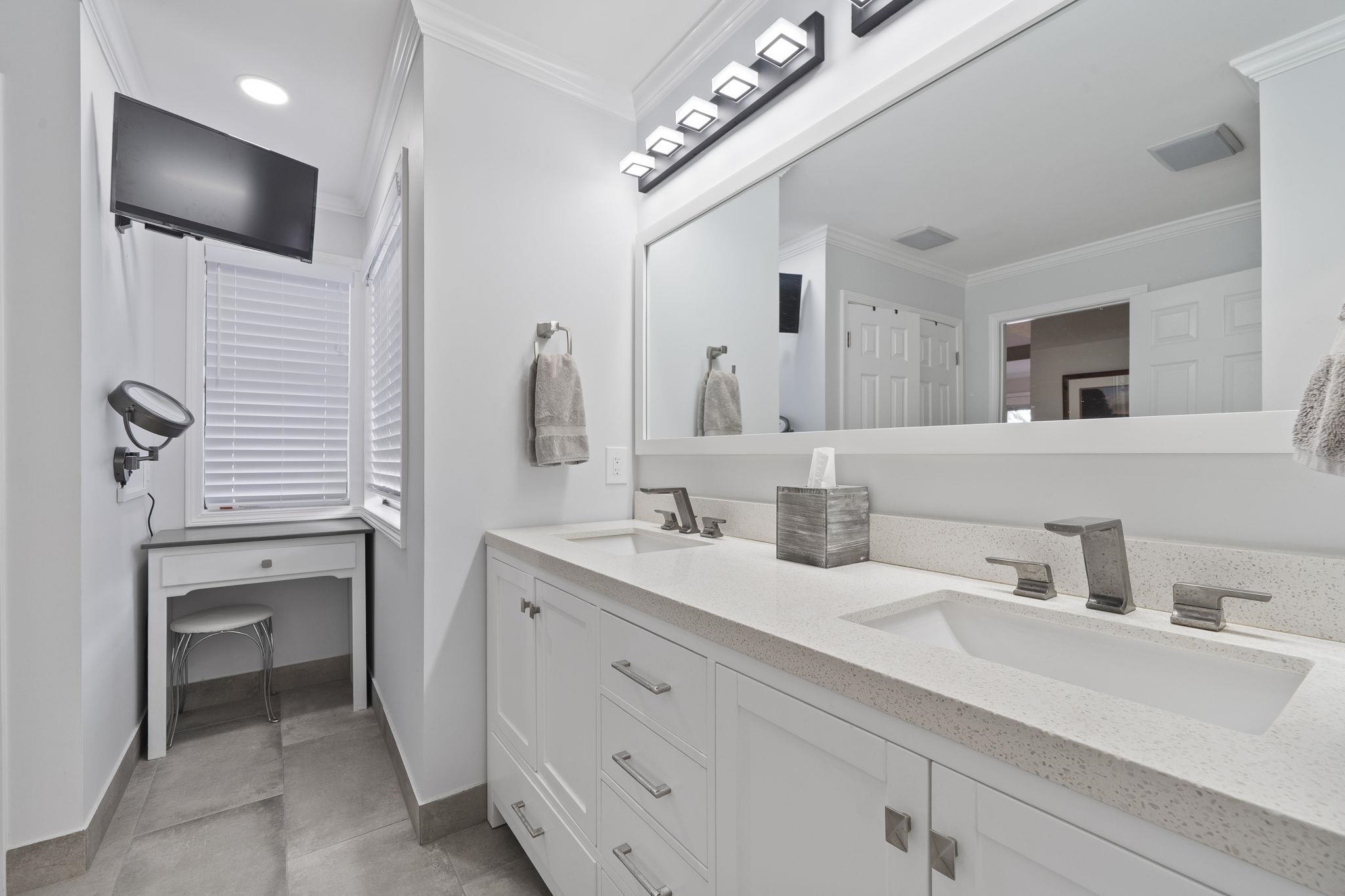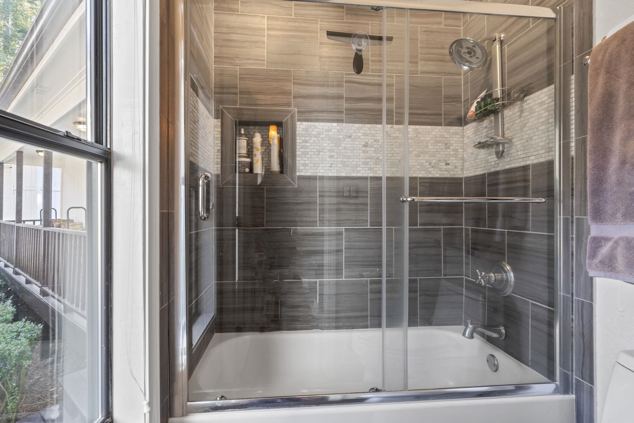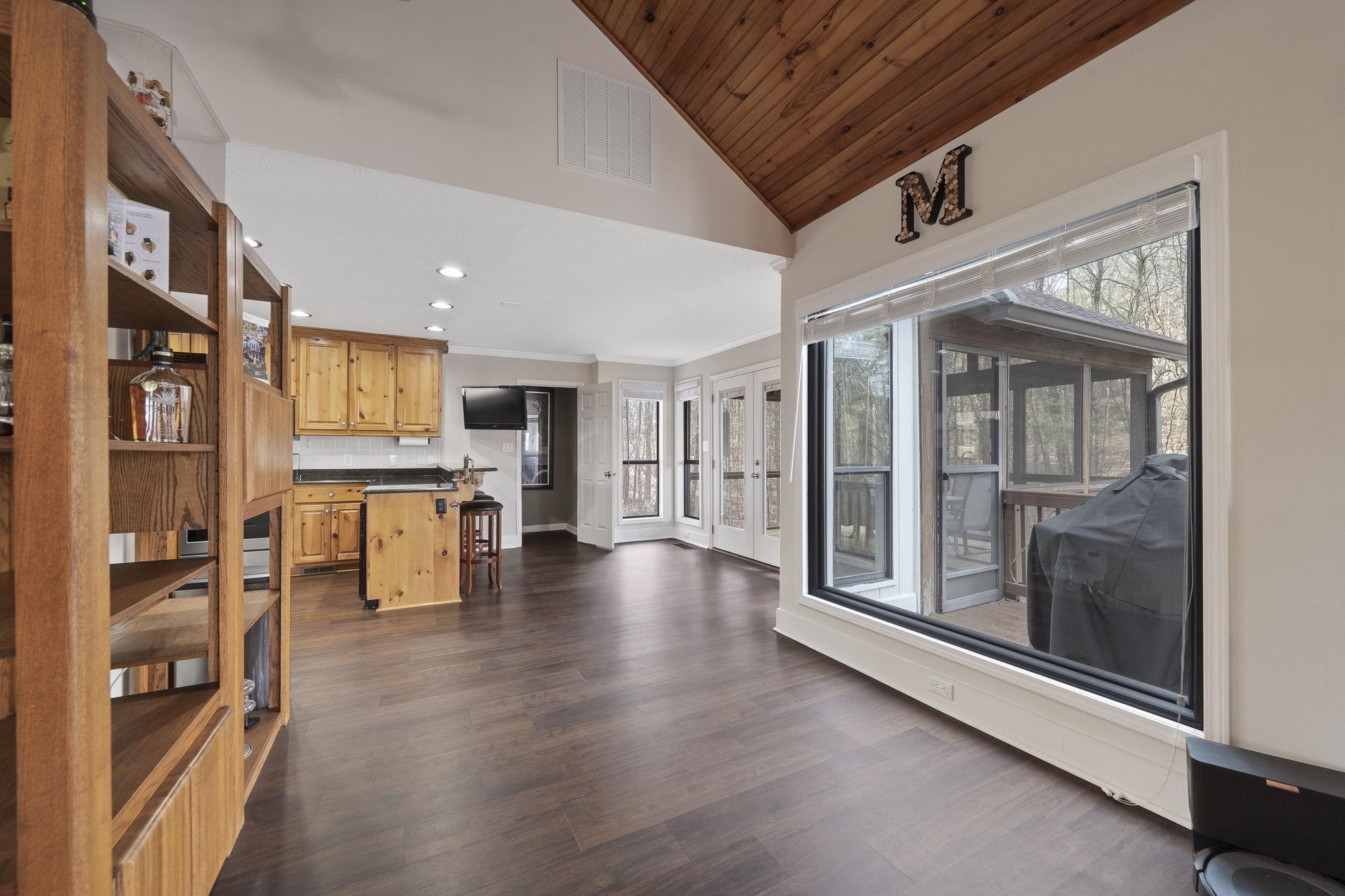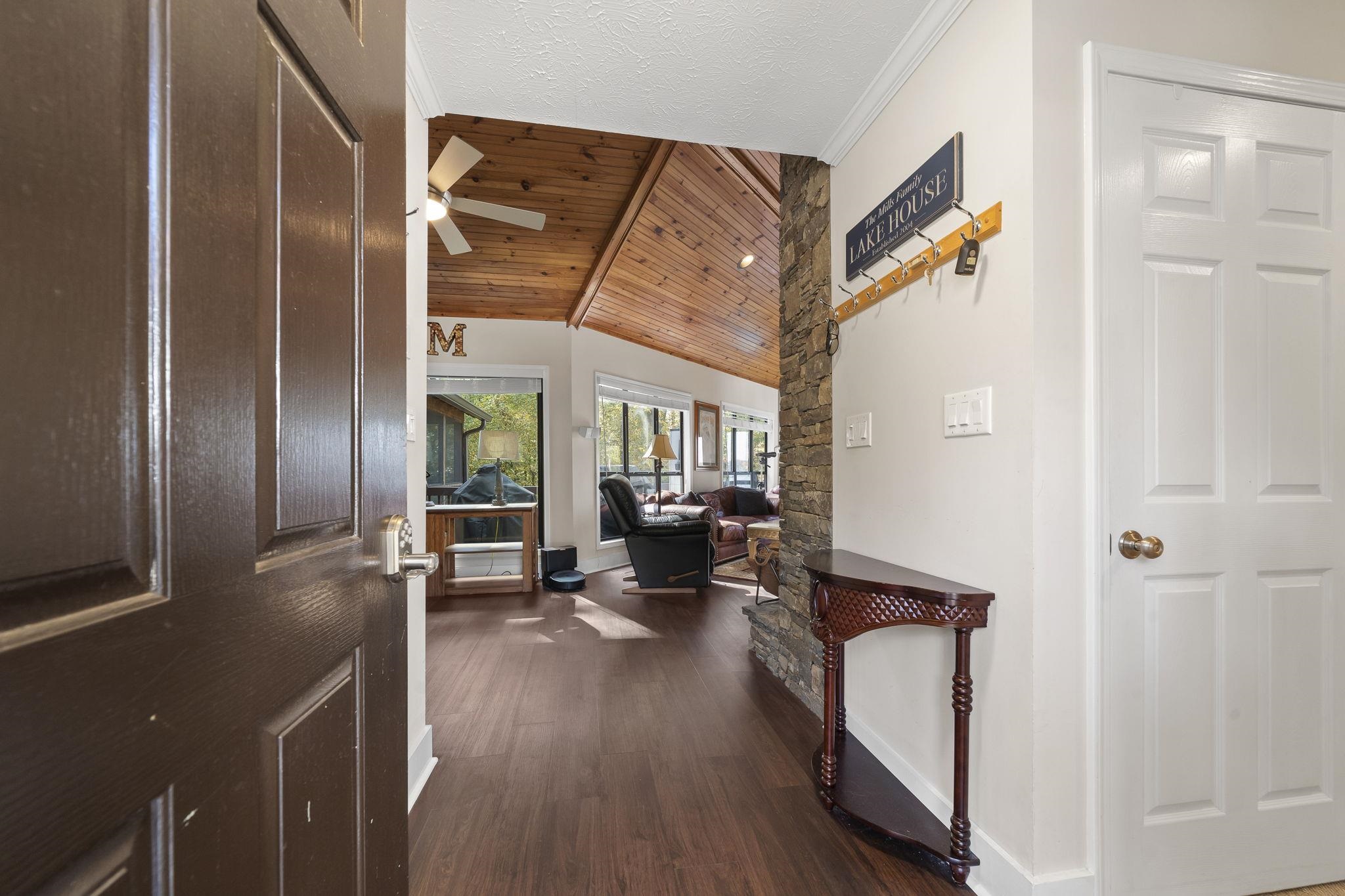 The ranch-style residence features five bedrooms and 3.5 baths, including a spacious primary suite on the main level with a fully renovated bath and dual vanities. The open-concept living area showcases a stacked-stone wood-burning fireplace, updated kitchen with bar seating, and a dining area that opens to a full-length lakeside deck and screened porch — ideal for outdoor dining and entertaining.