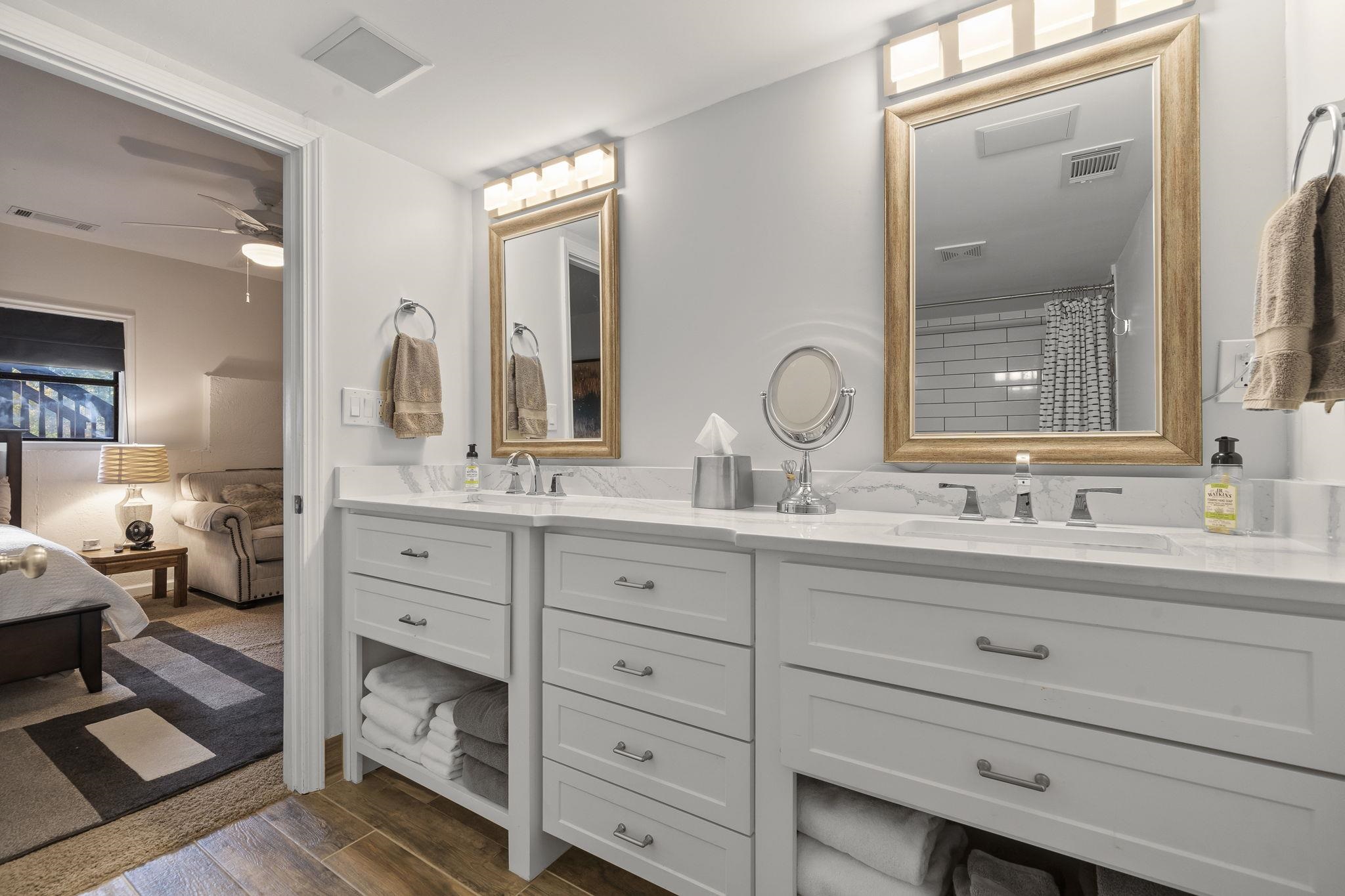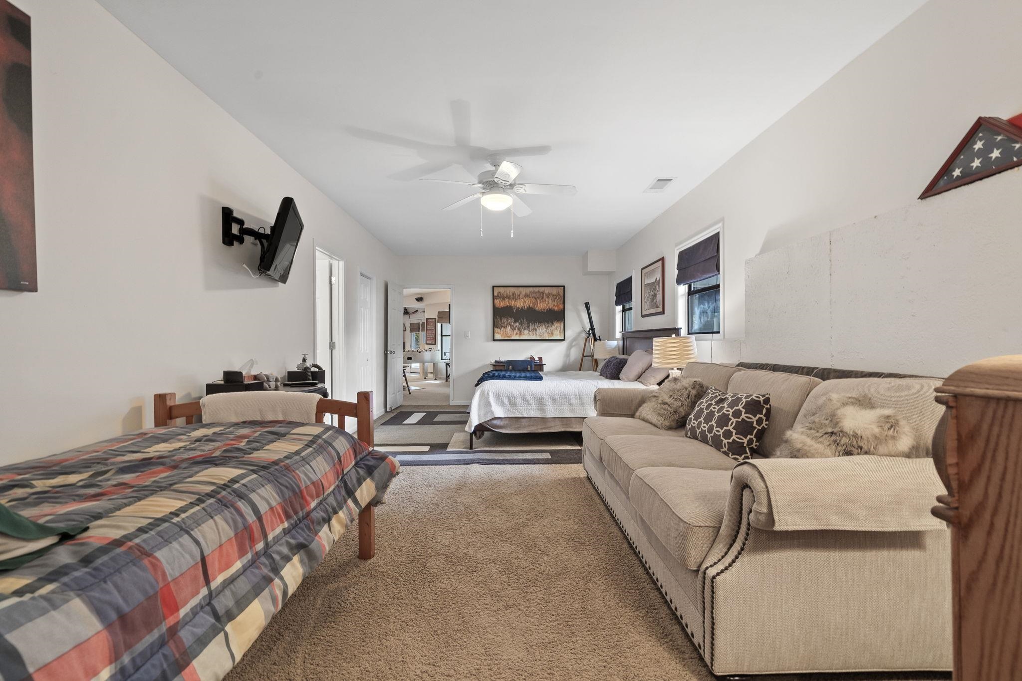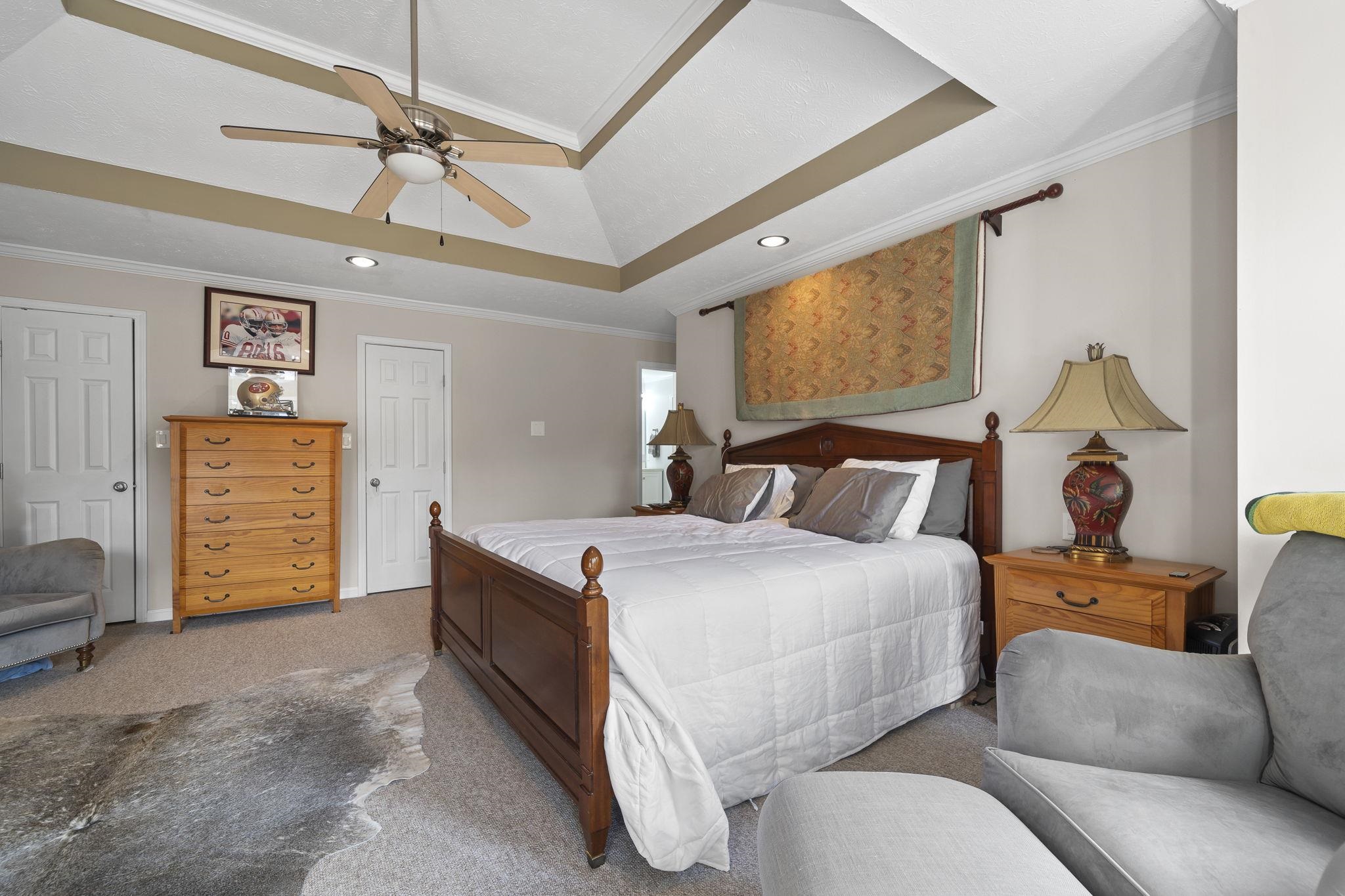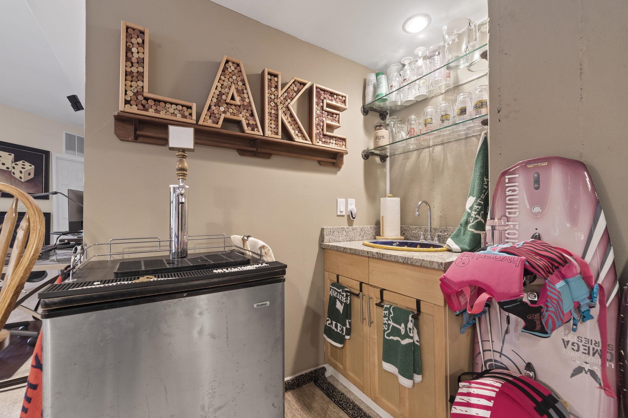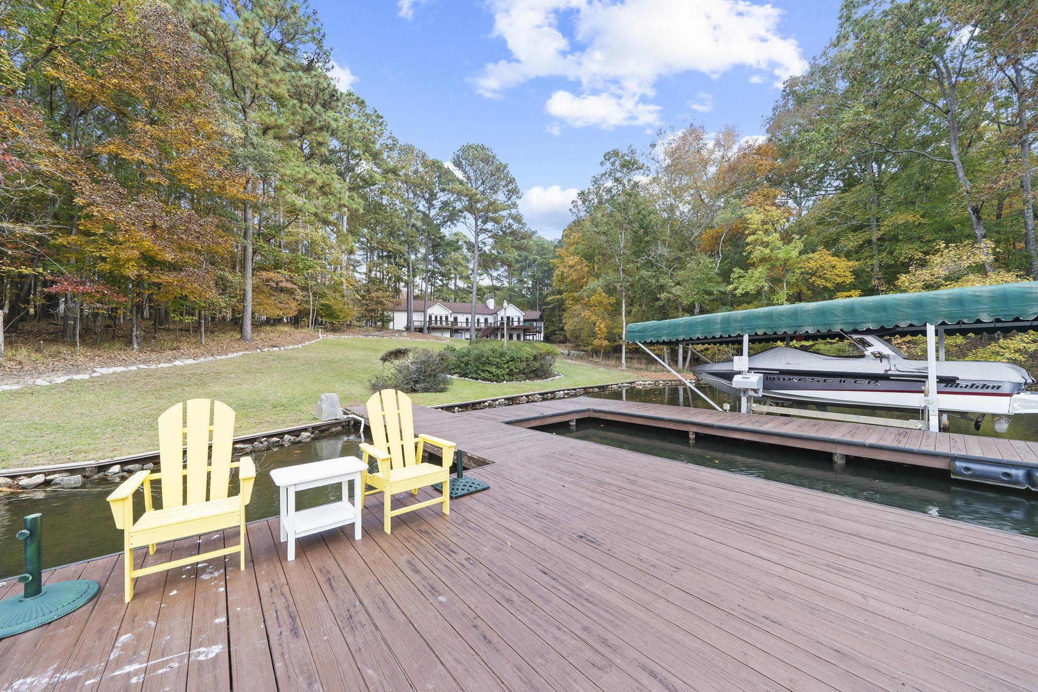 Outdoors, enjoy a max dock with boat lift, attached two-car garage, and a detached RV-size garage large enough for an SUV and wake boat with the tower up. The irrigation system pulls directly from the lake, and the property provides ample parking and storage.