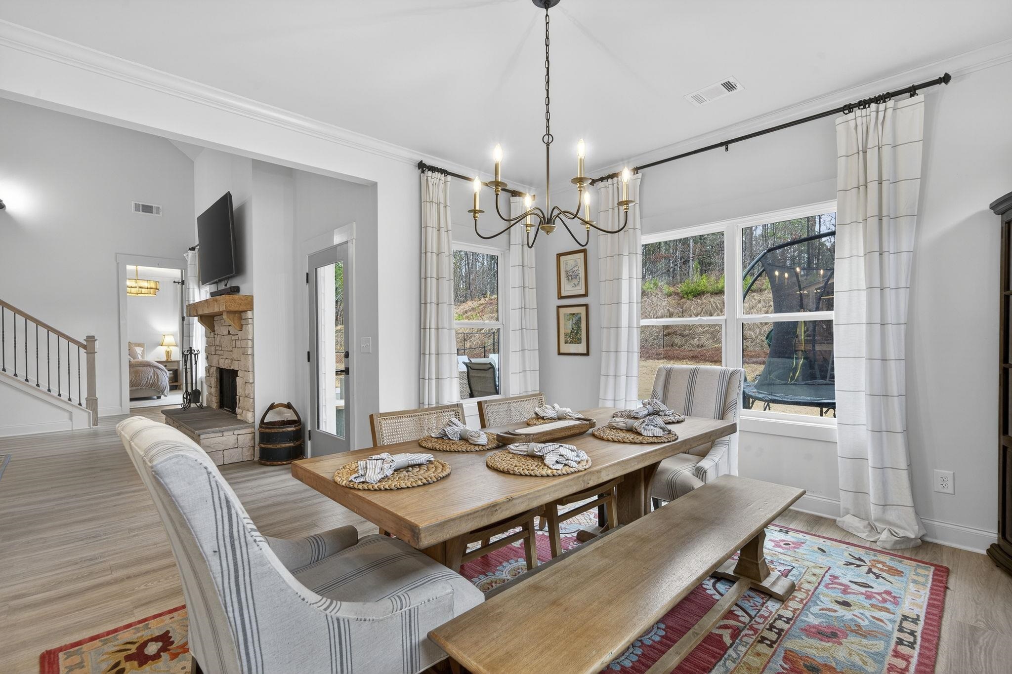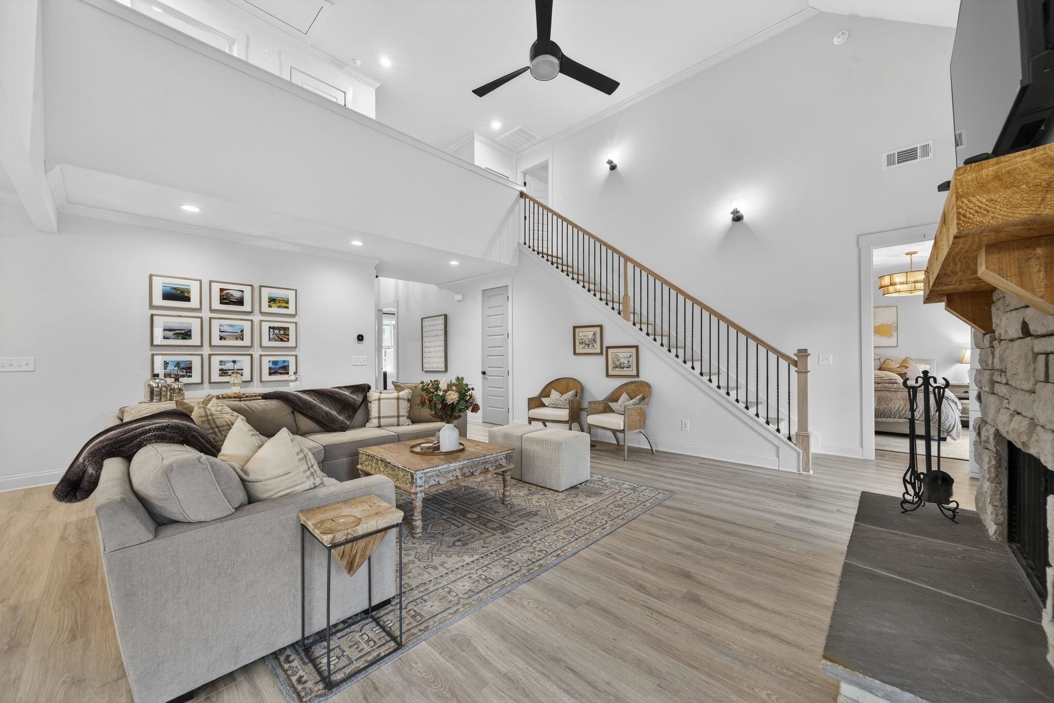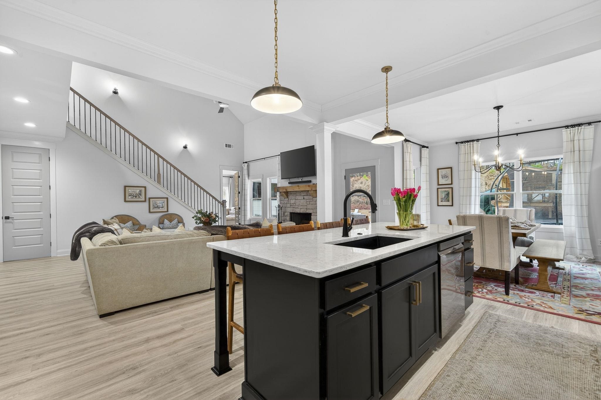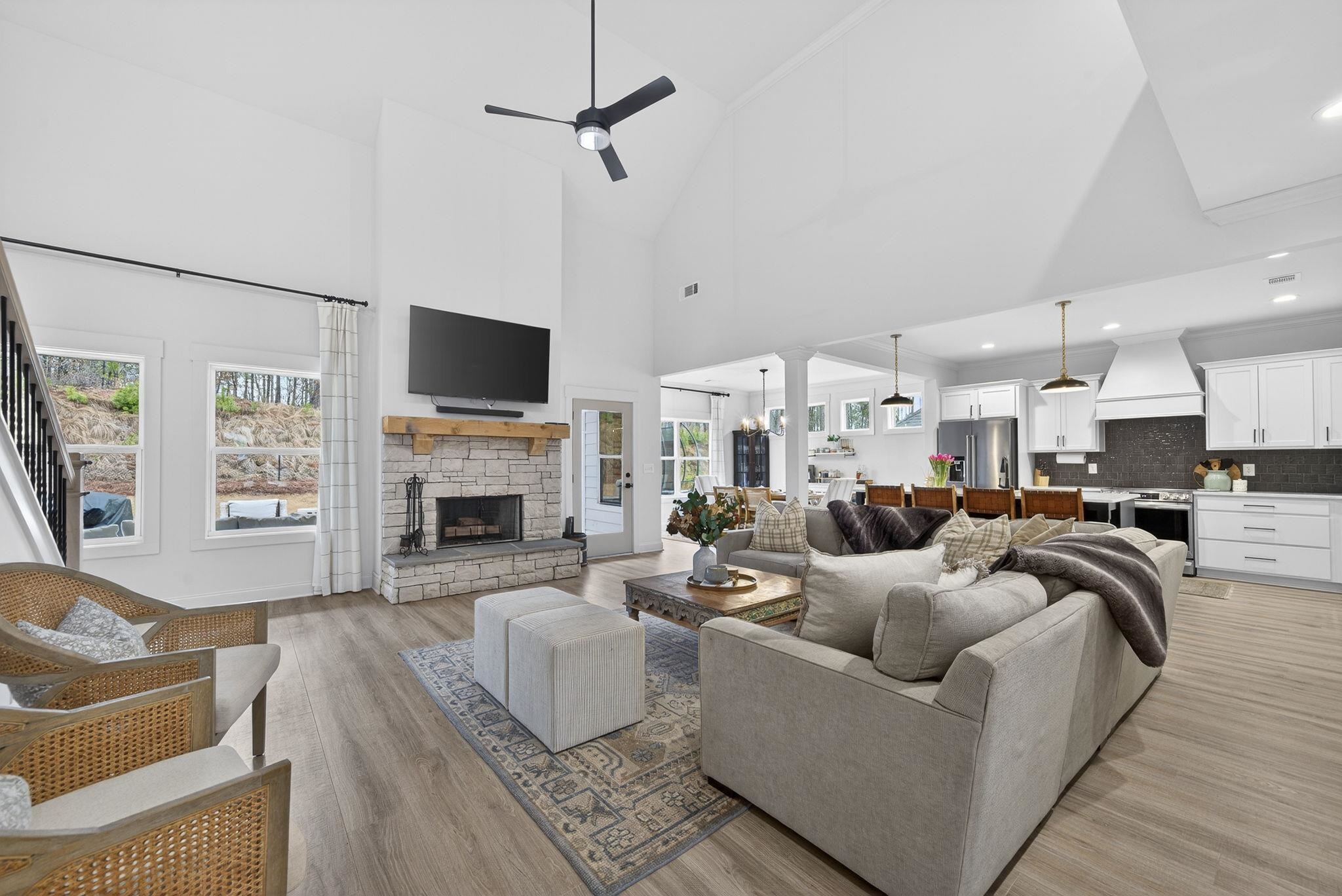 The home features an open-concept main living area with vaulted ceilings and a stone fireplace that anchors the space. Wide-plank flooring flows into the kitchen, where a large center island, white cabinetry, stainless appliances, tile backsplash, and upgraded lighting in both the kitchen and dining areas provide a functional and polished design.