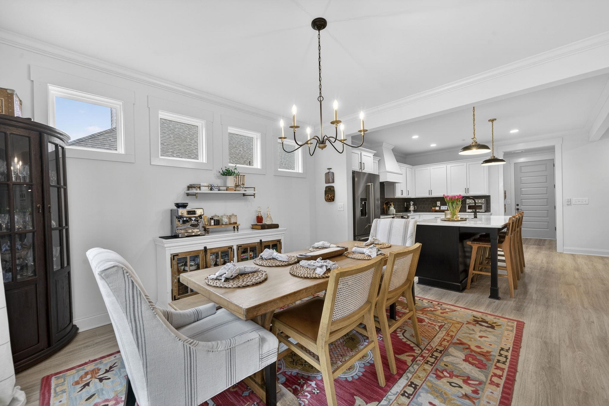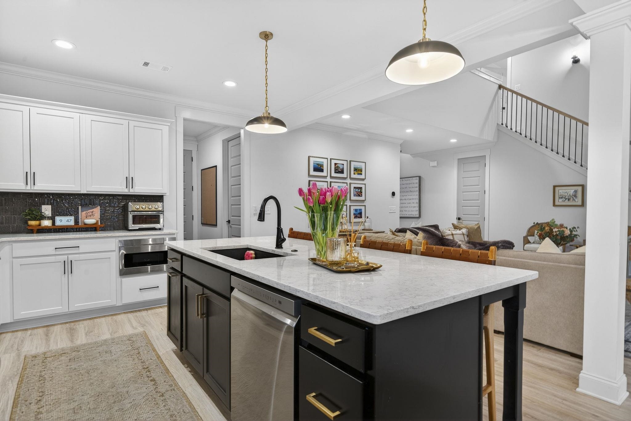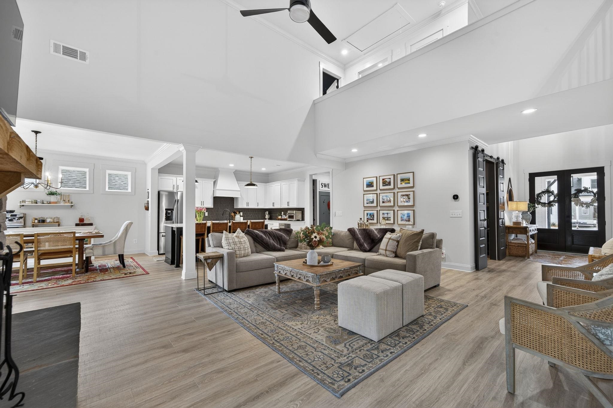 The home features an open-concept main living area with vaulted ceilings and a stone fireplace that anchors the space. Wide-plank flooring flows into the kitchen, where a large center island, white cabinetry, stainless appliances, tile backsplash, and upgraded lighting in both the kitchen and dining areas provide a functional and polished design.
