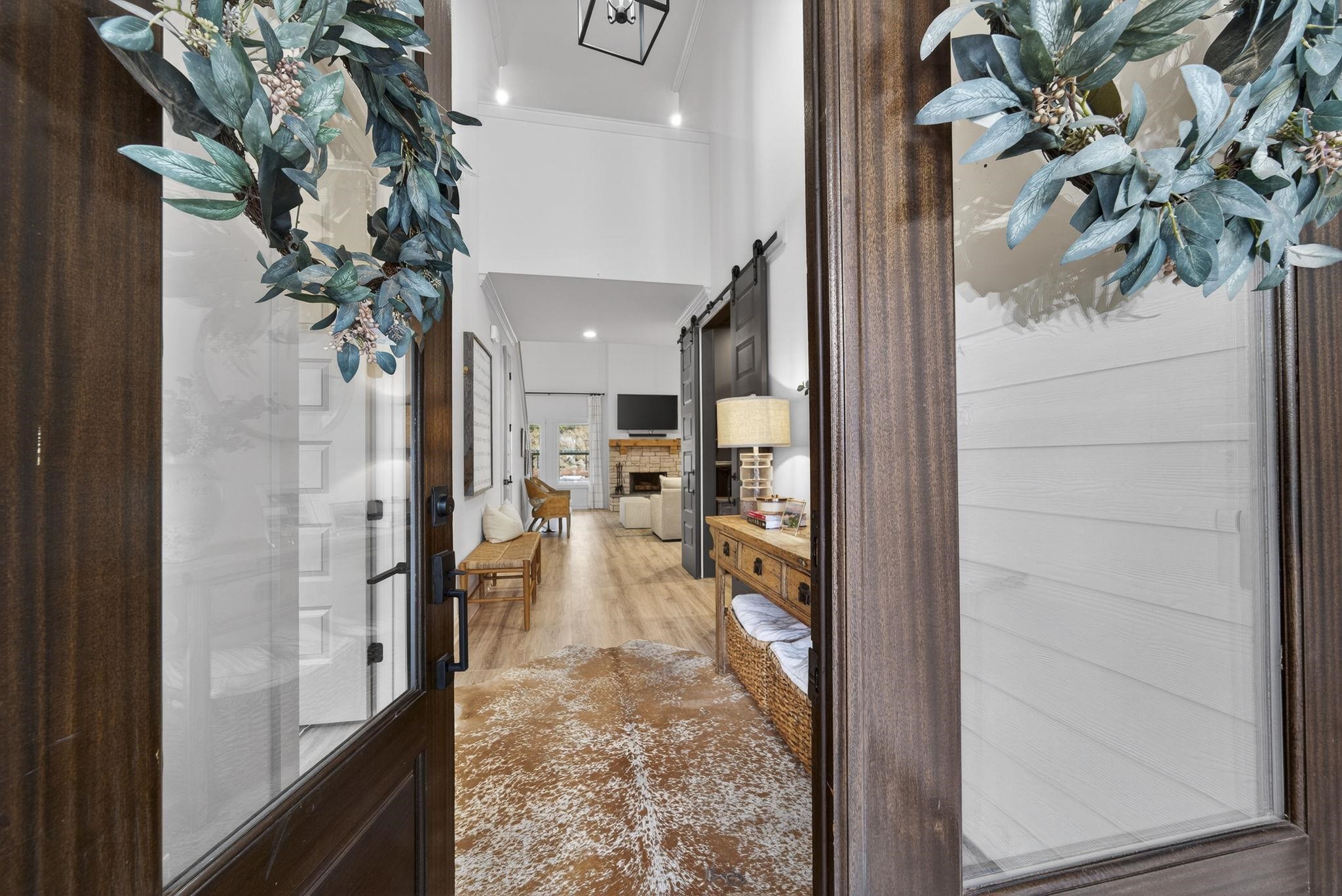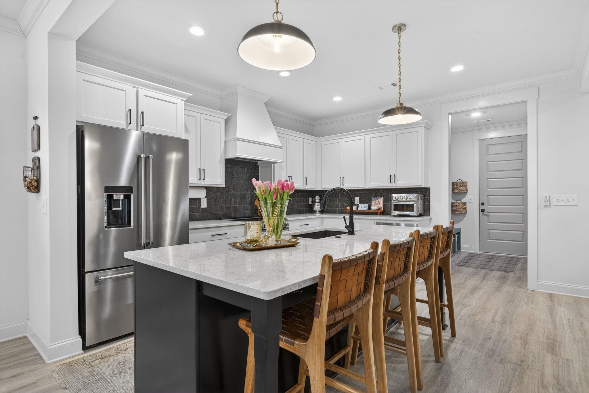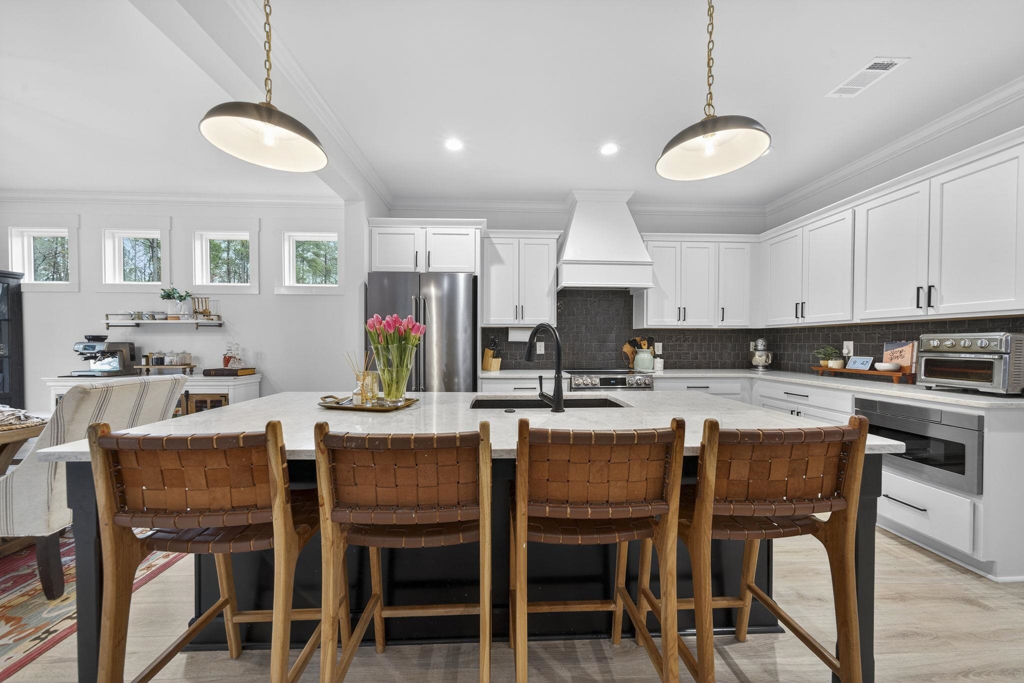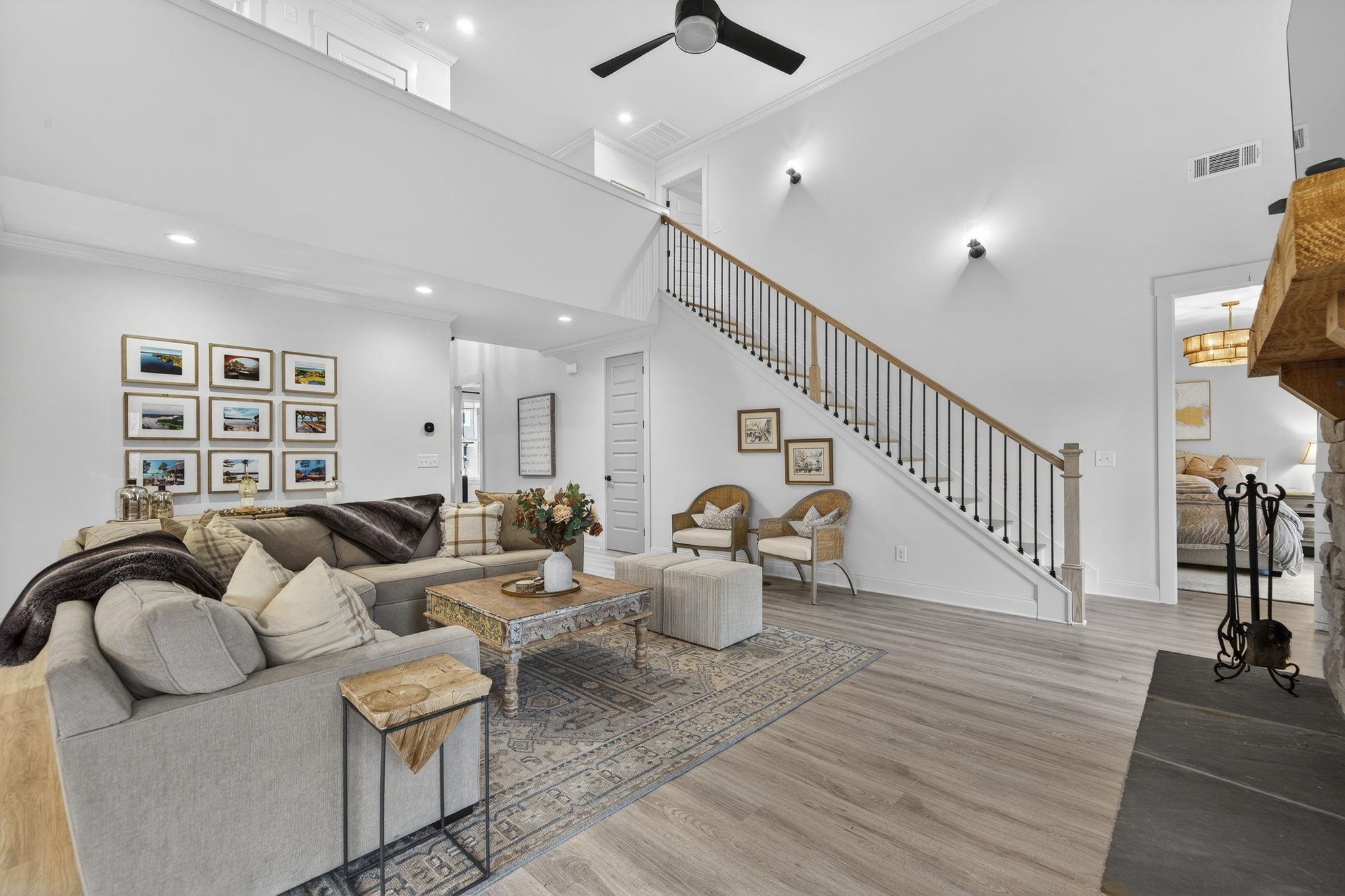 The home features an open-concept main living area with vaulted ceilings and a stone fireplace that anchors the space. Wide-plank flooring flows into the kitchen, where a large center island, white cabinetry, stainless appliances, tile backsplash, and upgraded lighting in both the kitchen and dining areas provide a functional and polished design.