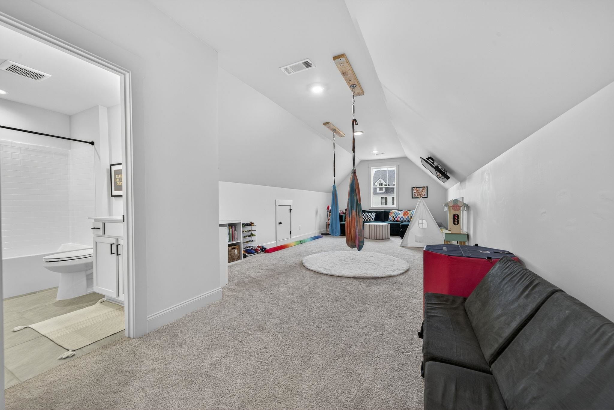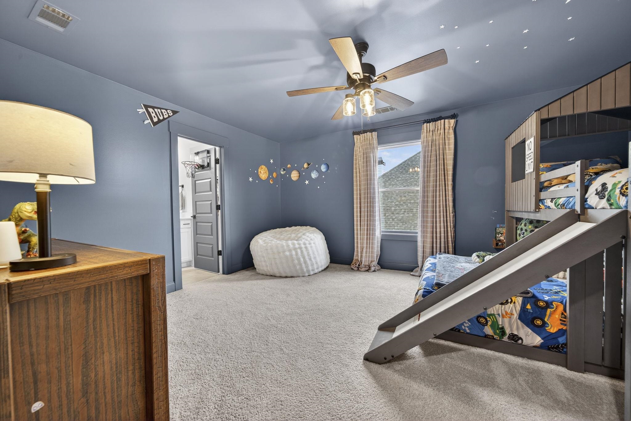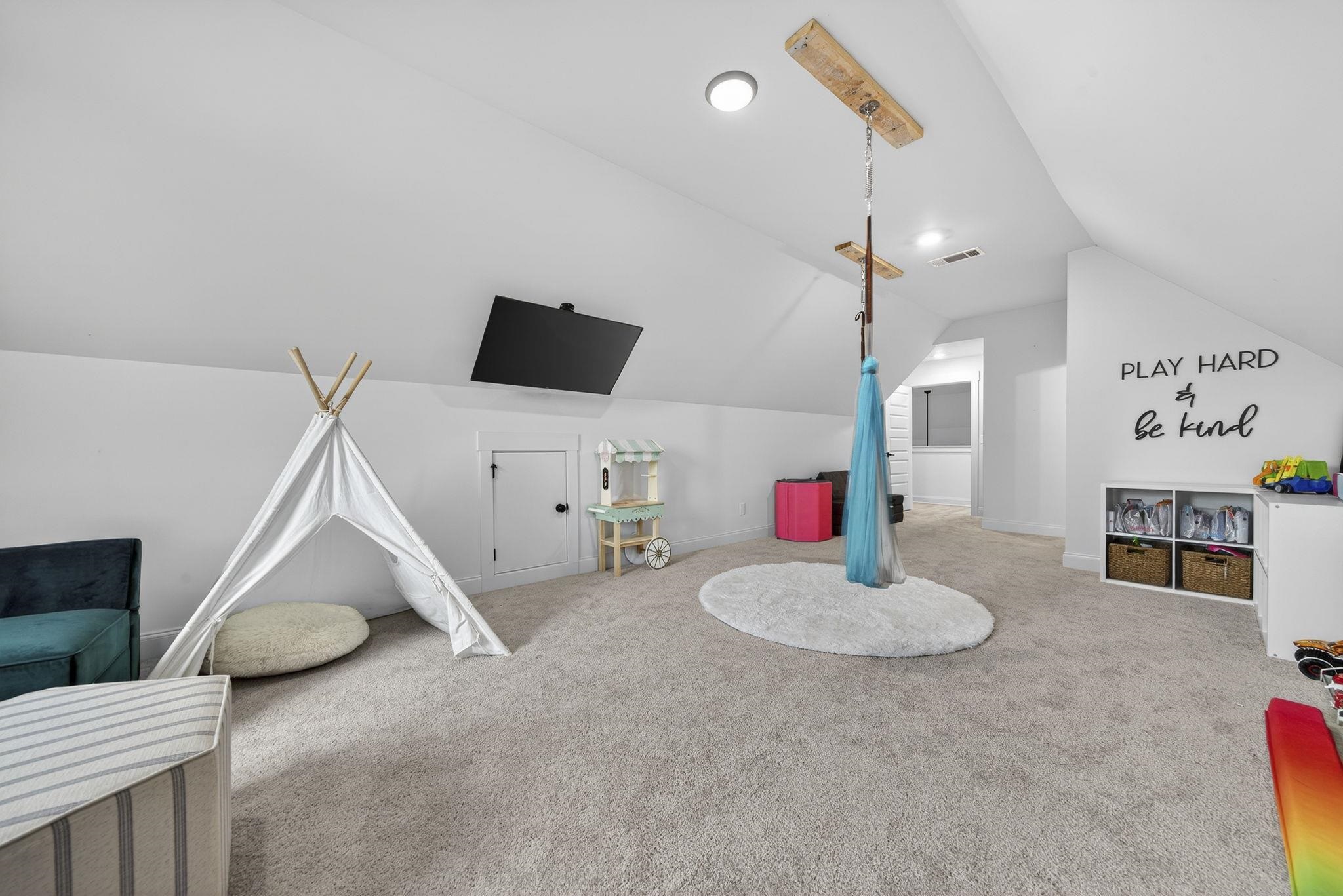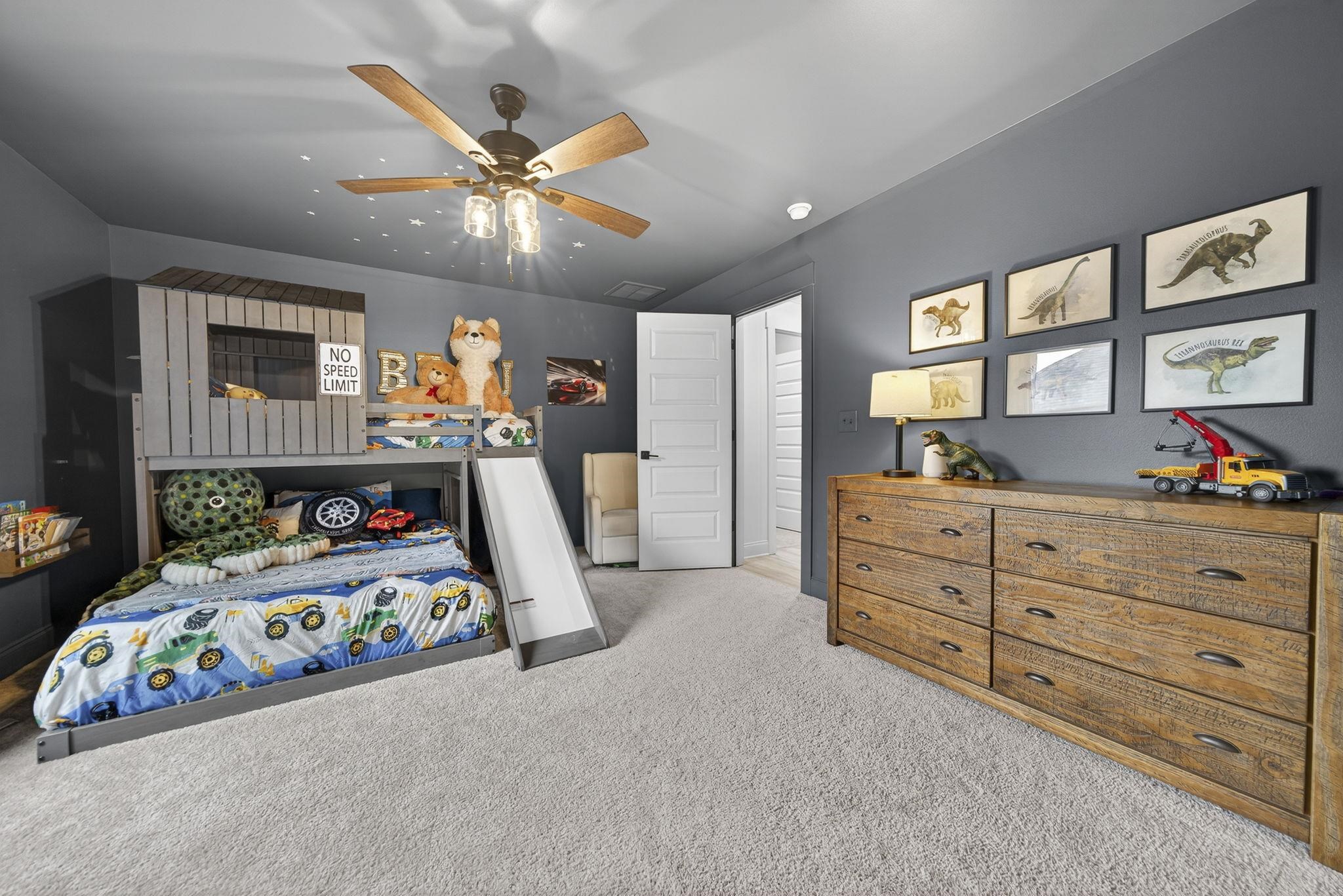 Outdoor living is enhanced by an extended rear patio, fenced backyard, and fire pit, creating usable space for year-round enjoyment. Additional improvements include upgraded interior doors, designer wallpaper accents, and a two-car garage equipped with GearTrack and slat wall storage. A custom playhouse with rubber mulch adds a unique outdoor feature.