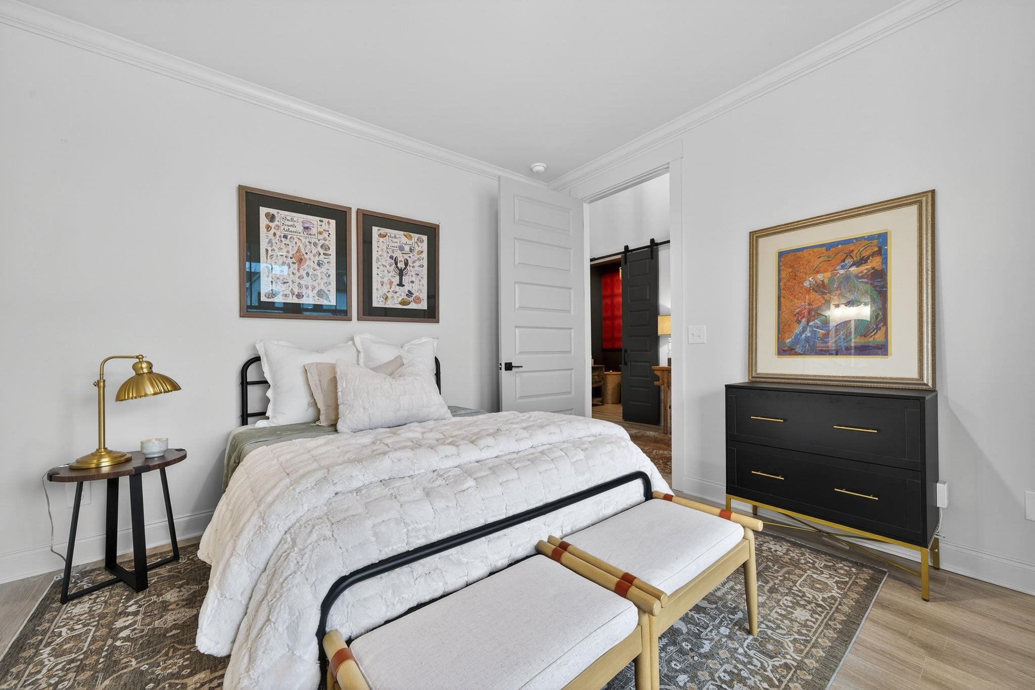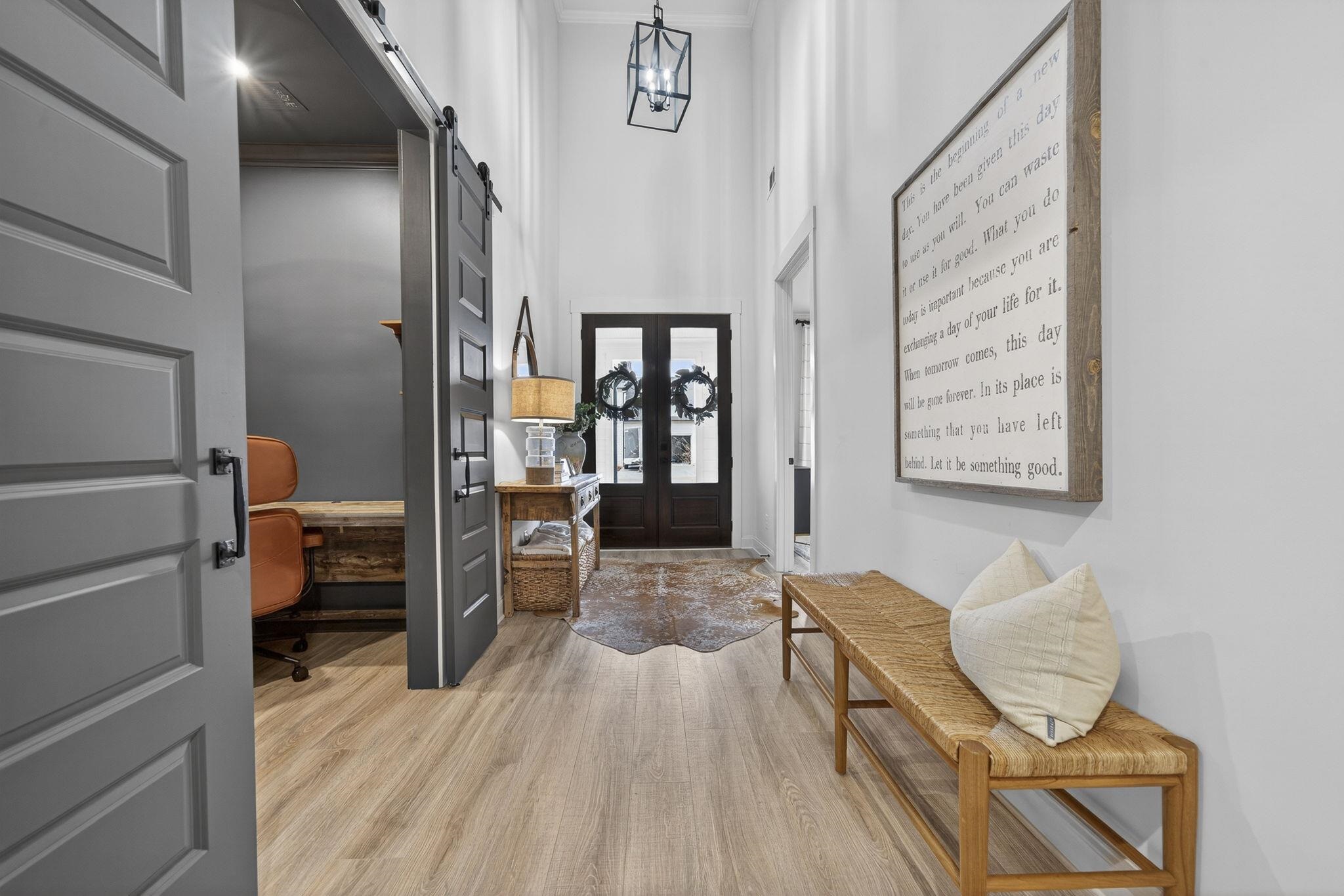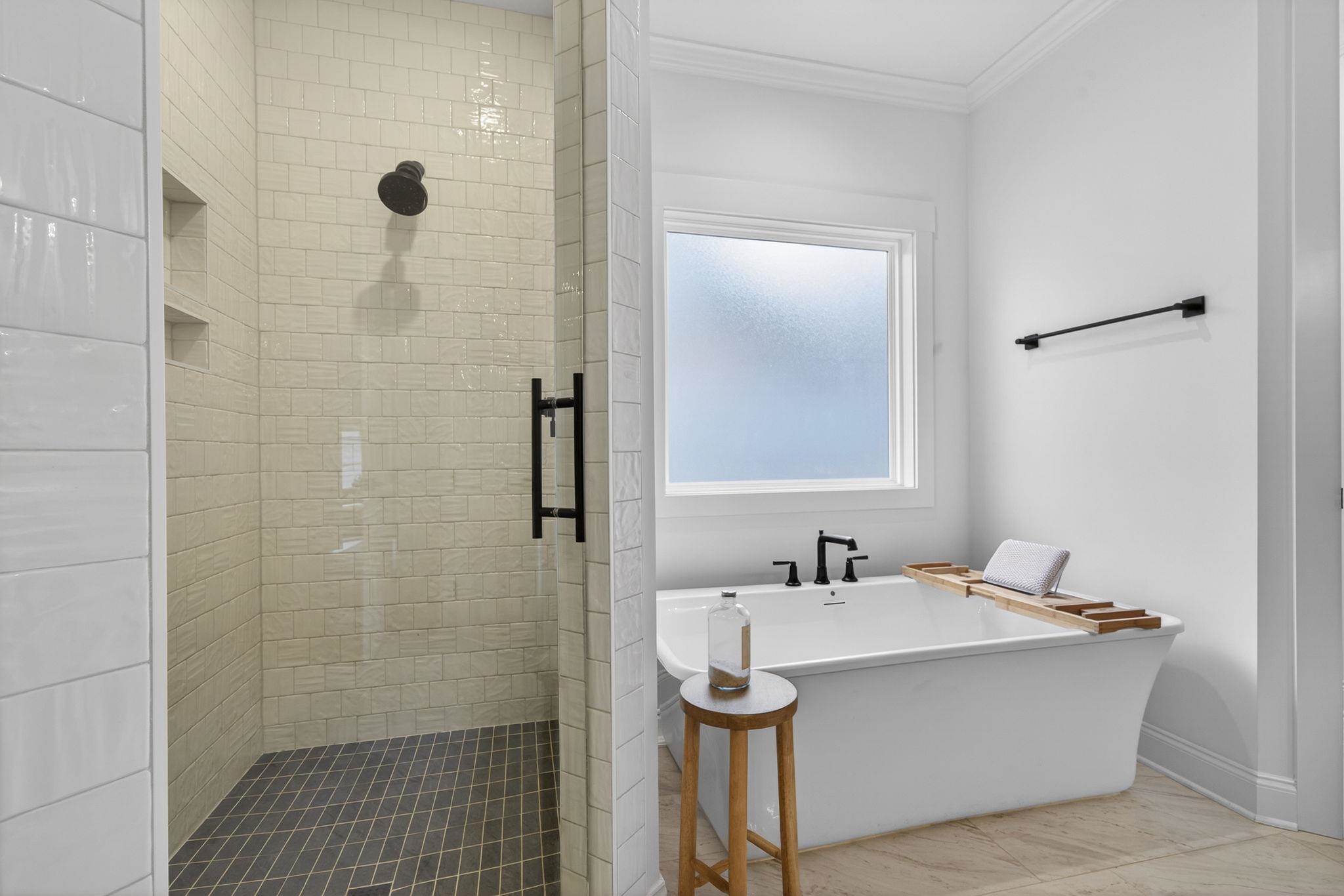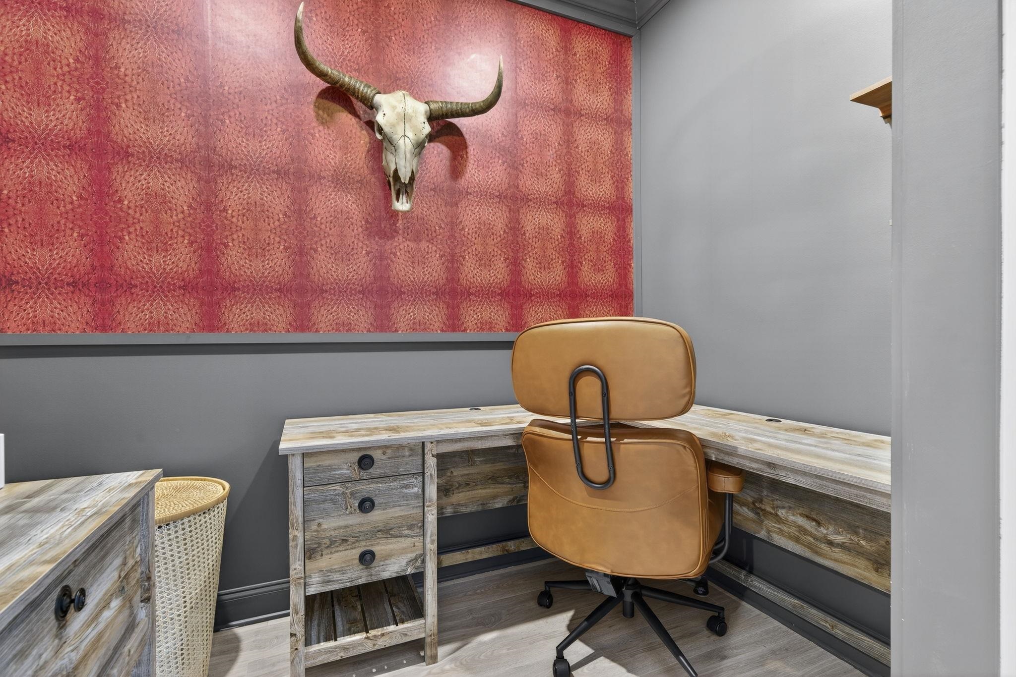 The main-level primary suite offers a private retreat with a spa-style bath, including a freestanding soaking tub, tiled walk-in shower with niche, and a custom closet system. A dedicated home office adds flexible space for remote work, study, or everyday use.