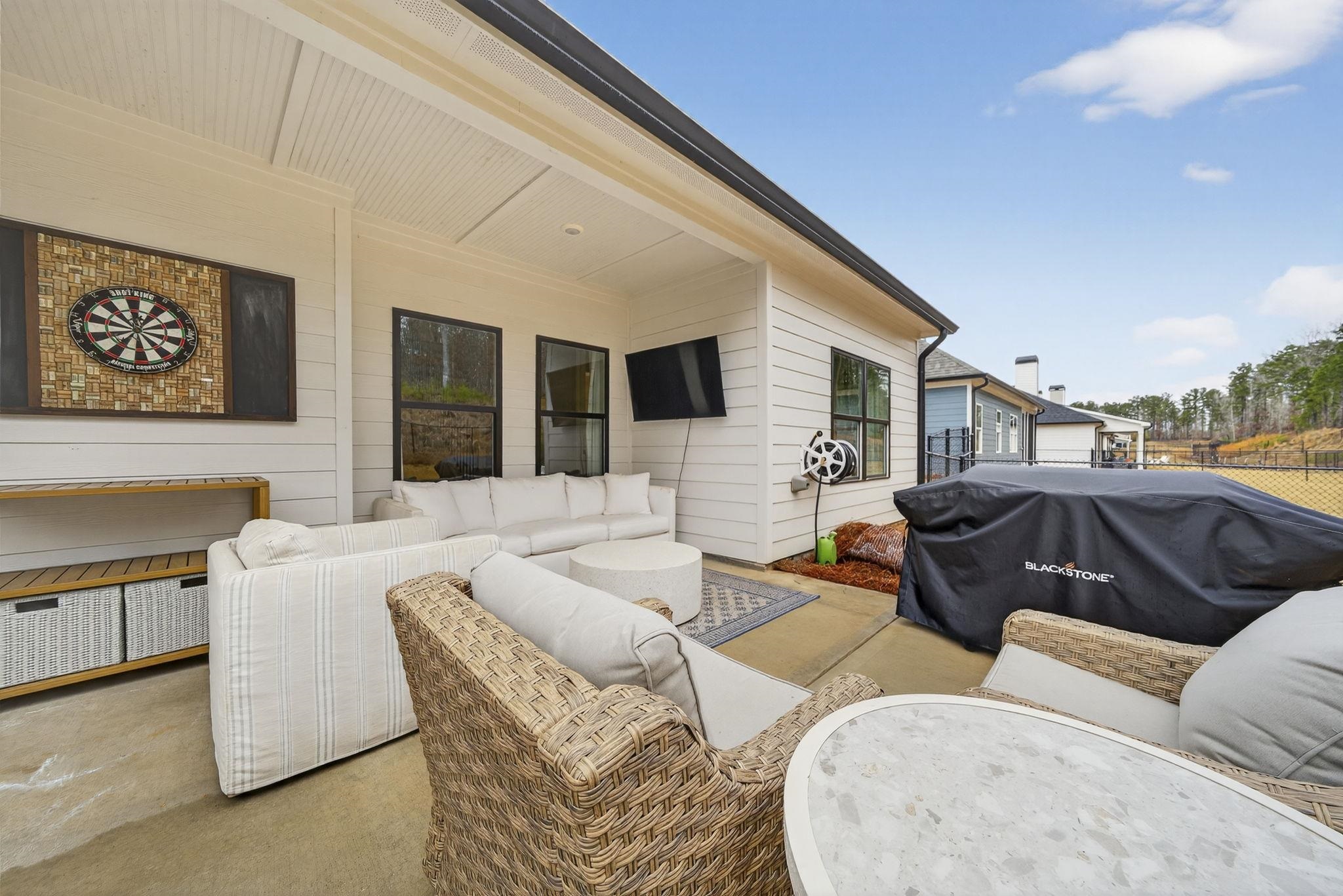 Outdoor living is enhanced by an extended rear patio, fenced backyard, and fire pit, creating usable space for year-round enjoyment.
